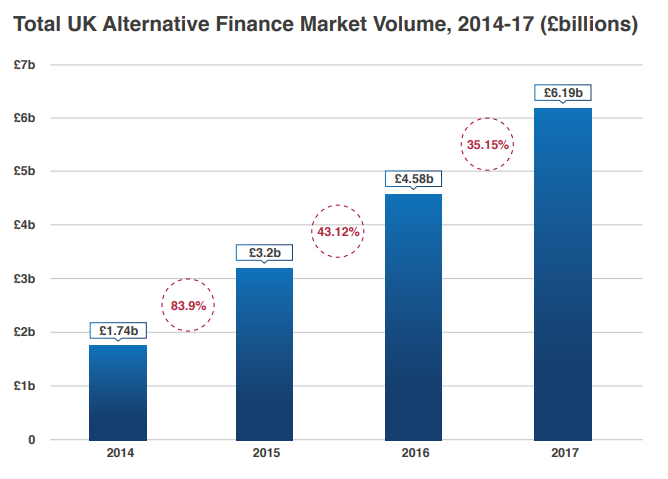 The UK online alternative finance industry market volume grew by 35% year-on-year to reach £6.19 billion in 2017. P2P Business Lending retained the top spot as the largest market segment in online alternative finance with £2 billion in transaction volume in 2017 and 66% year-on-year growth rate.