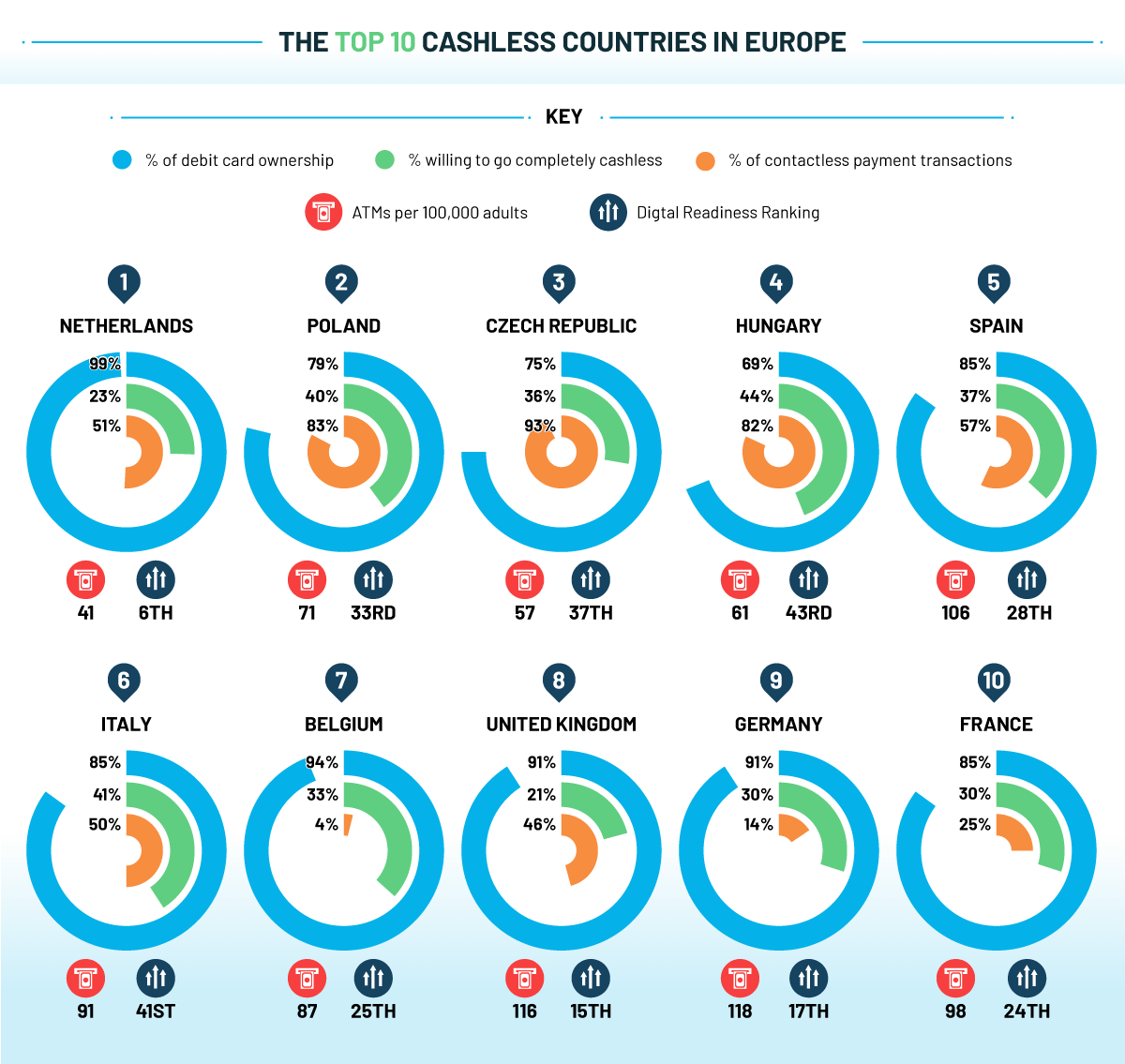 The Merchant Machine study notes that the Netherlands ranks 1st place as the most cash free country in Europe. With over half of payment transactions being contactless, the country also has the highest debit card ownership, with 99% of people owning one.
