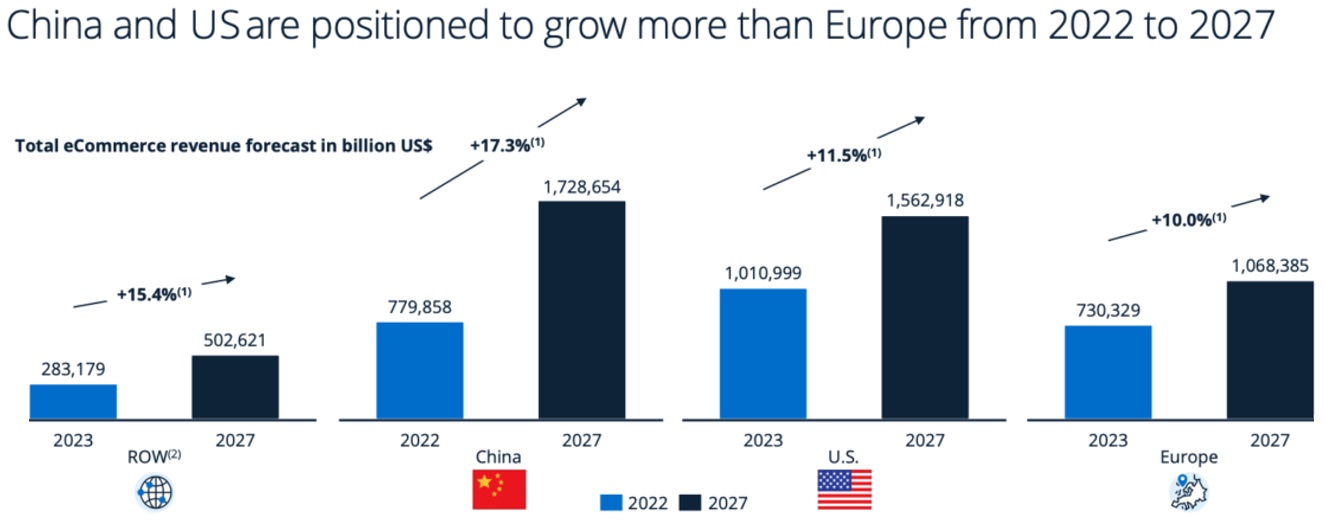 As we navigate the globe’s e-commerce landscape, China and the US are emerging as dominant growth leaders, overshadowing Europe: