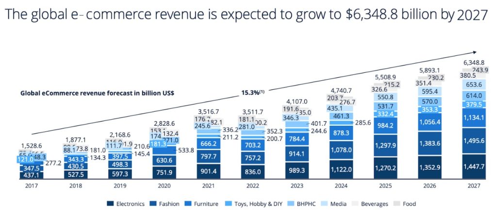 Global e-commerce revenue to grow 64.69% by 2027