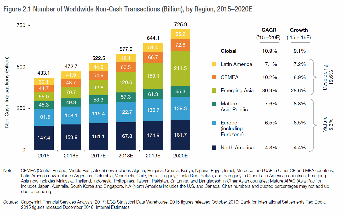 According to the World Payments Report, global non-cash transaction volumes grew 11.2% during 2014–2015 to reach 433.1 billion, the highest growth of the past decade, and slightly above last year’s prediction. Two regions fuelled this increase: Emerging Asia with a growth rate of 43.4% and CEMEA (Central Europe, Middle East, and Africa), with 16.4% growth.