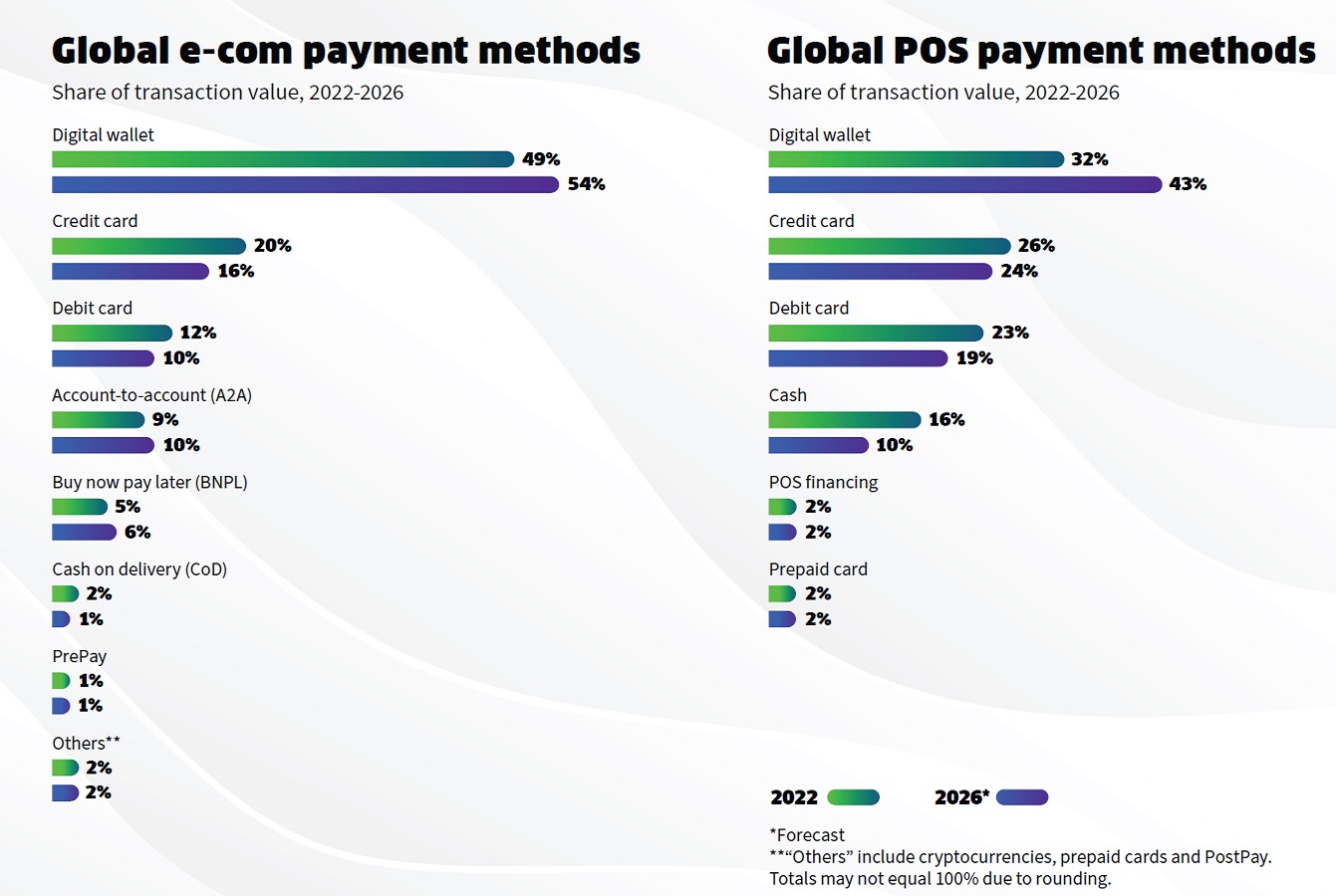 - Digital wallets continue to be the leading payment method globally, accounting for 49% of transaction value in e-commerce and 32% at the POS in 2022.