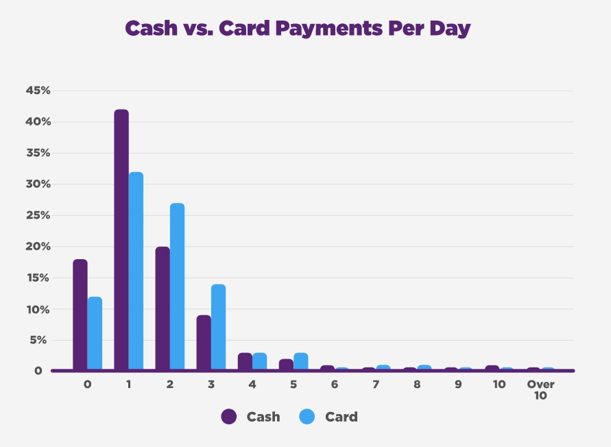 As to be expected, 18-24 year olds lead the way with most card payments each day (2.3), yet they also have the highest average for cash payments when looking at age. All of which points to 18-24s simply spending more money than other age groups each day.