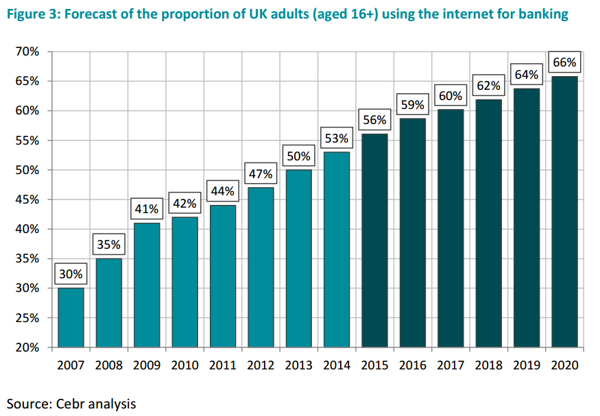 This upward trend in online banking usage, combined with inflation and a stronger economy, suggests that by 2020, as much as £9.4 billion could be moved through online banking per week.