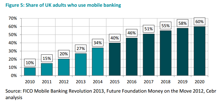 The number of mobile banking users is set to almost double from 17.8 million to 32.6 million by 2020, whilst the number of UK adults using online banking will increase from 27.7 million to over 35 million, according to a report, Future Trends in UK Banking, compiled by the Centre for Economics and Business Research (Cebr).
