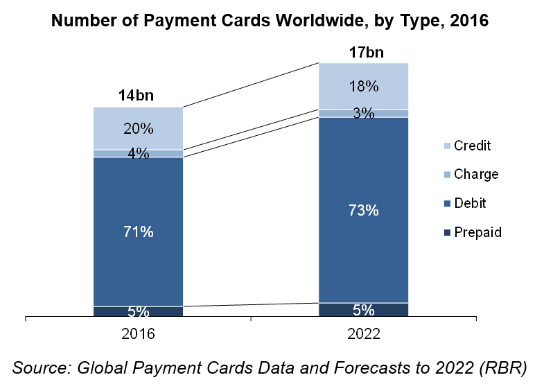 The number of payment cards globally reached 14 billion in 2016 and is predicted to rise to 17 billion by 2022, driven by further debit card issuance as the banked population increases.