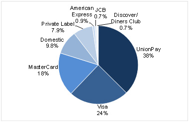 UnionPay’s share will move above 40% in the coming years, barring a marked slowdown in the expansion of its home market or an overhaul of current regulations which require the UnionPay brand to appear on all Chinese cards. UnionPay’s entry into other markets, including Russia in 2013, will cement its position as the leading scheme in terms of card numbers.
