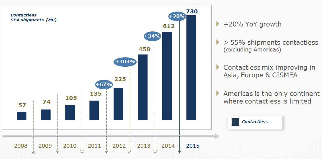 foothold. In 2015, 56% of all smart card shipments globally (excluding the Americas) featured contactless technology – a 24% growth as compared to the year before.