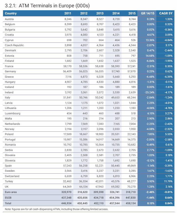 The ATM remains relevant, but usage varies depending on the country: Germany leads the way with 48% of respondents using ATMs just as much as they always have, despite widespread availability of new digital forms of payments; this is followed by Spain at 47%, the UK at 42%, France and Italy at 40%, the US at 34% and Hungary at 29%.