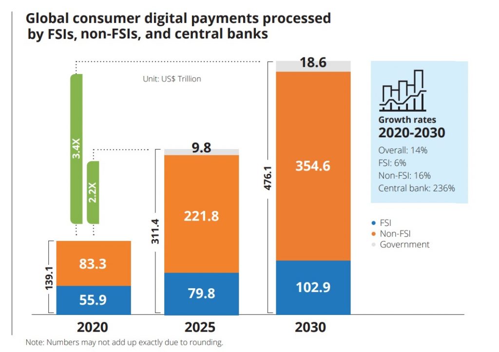 In 2020, 40% ($55.9 trillion) of global consumer payments were handled by FSIs and 60% ($83.3 trillion) were handled by non-FSIs.