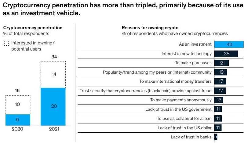 Turning to cryptocurrency, its penetration remains nominal on a broad level, but its steep adoption curve is striking. One in five respondents report holding or having held crypto assets, up from 6% just a year earlier.