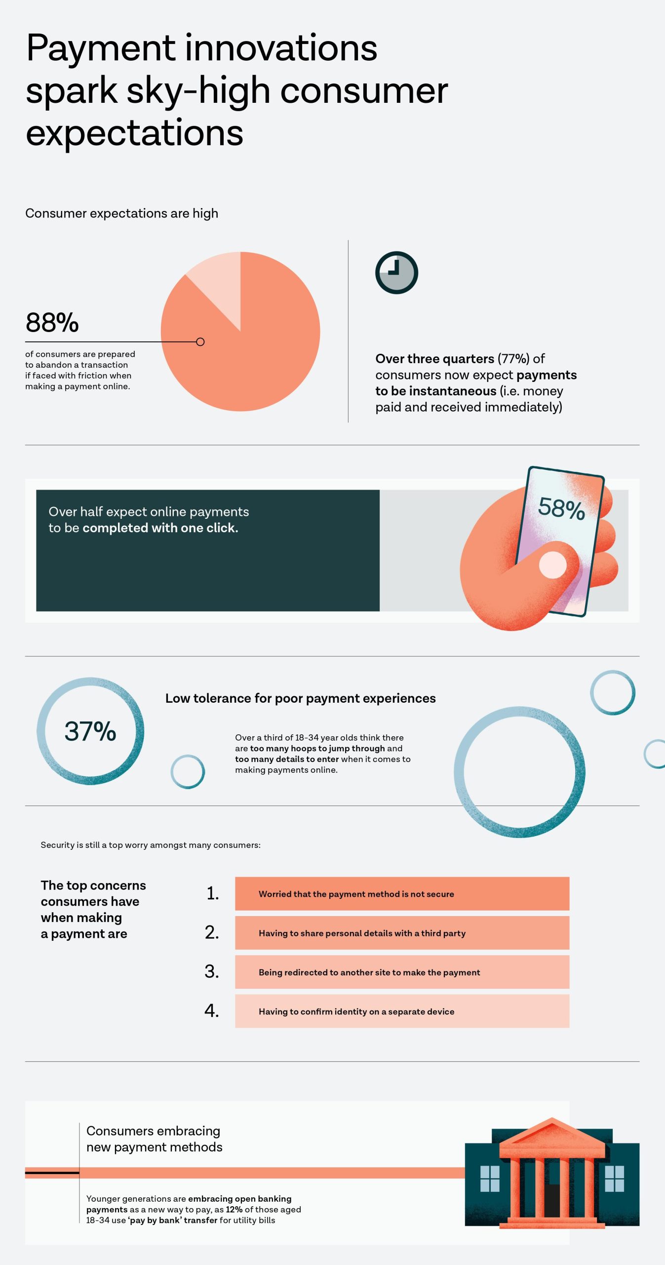 However, the arrival of new payment methods has set the bar high when it comes to consumer expectations. Over three quarters (77%) of consumers now expect payments to be instantaneous (i.e. money paid and received immediately) while over half (58%) expect online payments to be completed with one click.