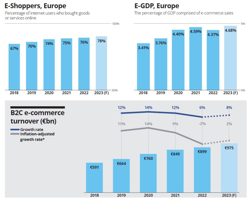 In 2023, e-commerce started recovering as inflation declined, leading us to project a return to growth in 2023 (+2%).