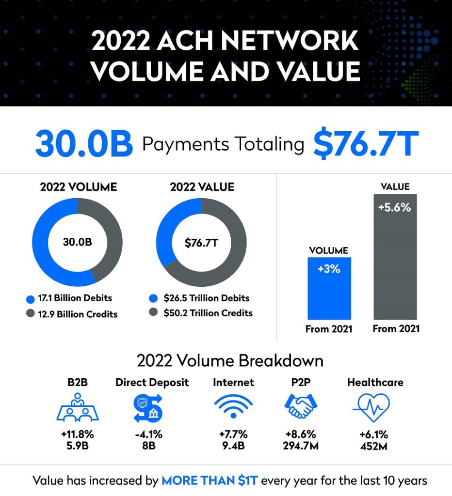 The modern ACH Network processed 30 billion payments valued at $76.7 trillion in 2022, increases of 3% and 5.6% respectively over 2021.