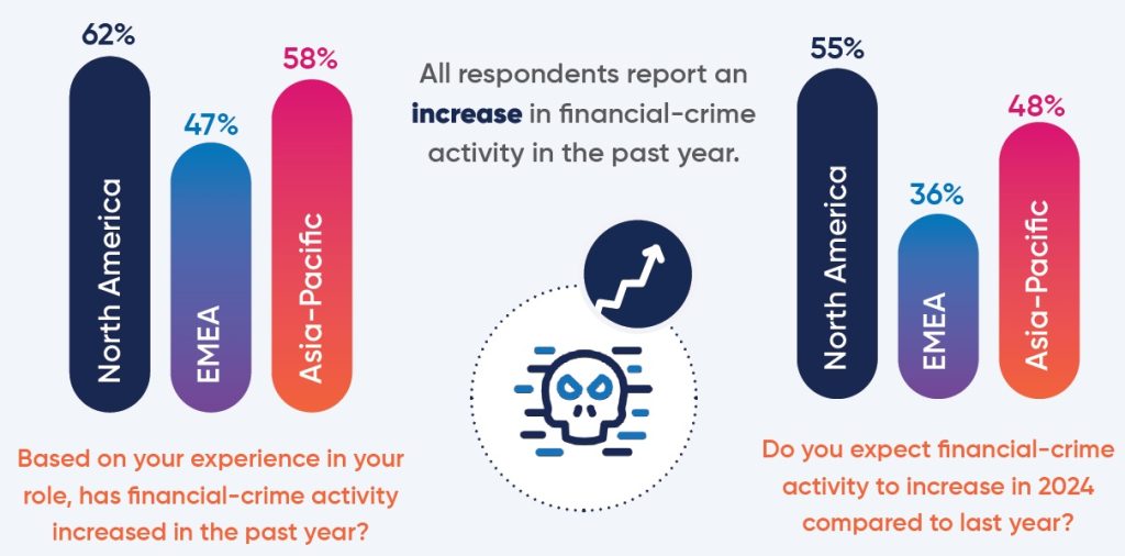 Equally concerning, around half of those same fraud-fighters report an increase in financial crime activity in the last year, and/or expect to see financial crime activity increase in 2024.