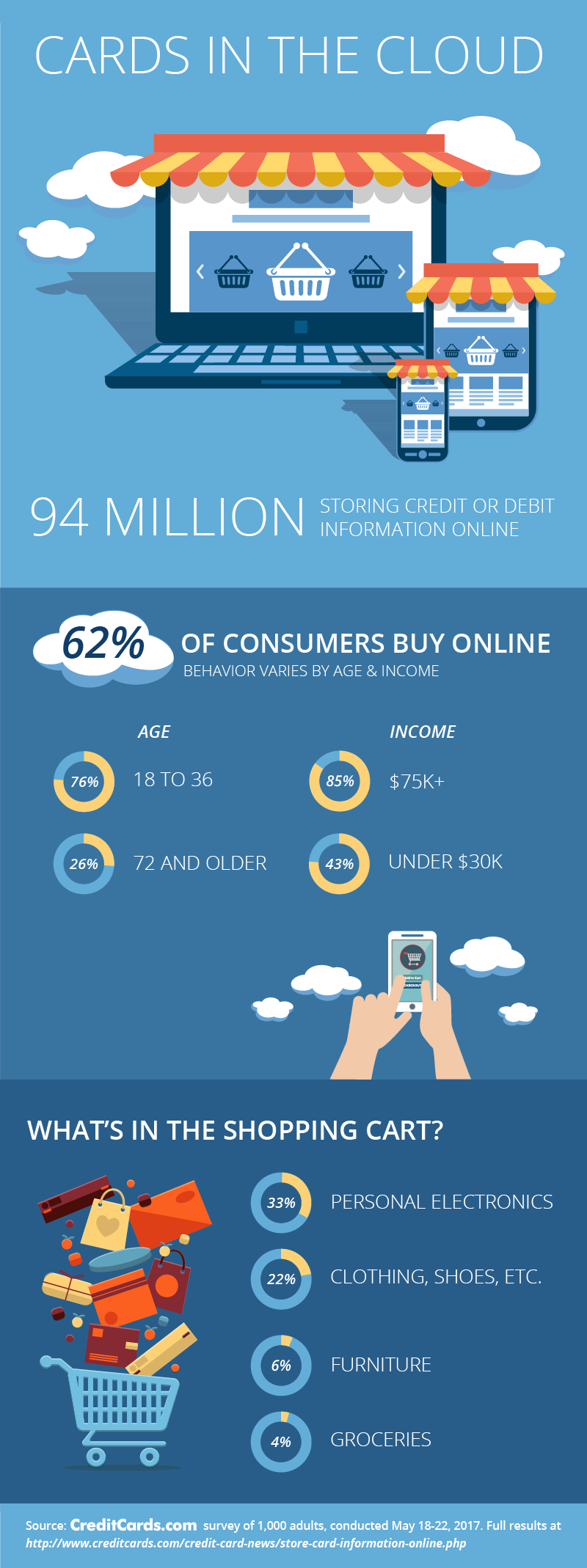 Two out of every three online shoppers have their card information stored on at least one website or mobile app for future purchases, the poll found. And about 10% say they always save their card information online, no matter where they’re shopping. If you extrapolate that out across the population, that means 94 million Americans let retailers store their credit or debit card data, and 14 million always do so.