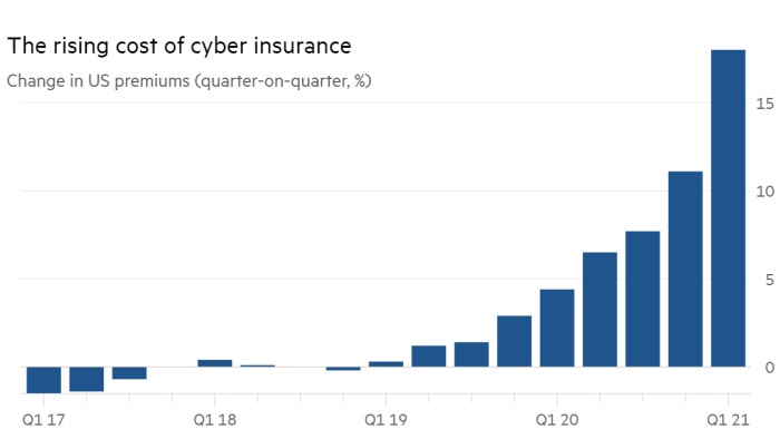 Evidence of insurers’ concern is multiplying. A survey by The Council of Insurance Agents and Brokers, a US industry body, found that 73% of its members — those who find coverage on behalf of companies — reported a decrease in underwriters’ capacity to take on cyber risks in Q1 2021.