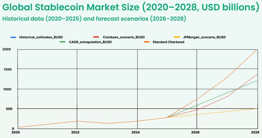 Alongside the rise of CBDCs, stablecoins are transitioning from speculative assets to regulated financial instruments. The market—valued at $246 billion today—is forecast to exceed $2 trillion by 2028.