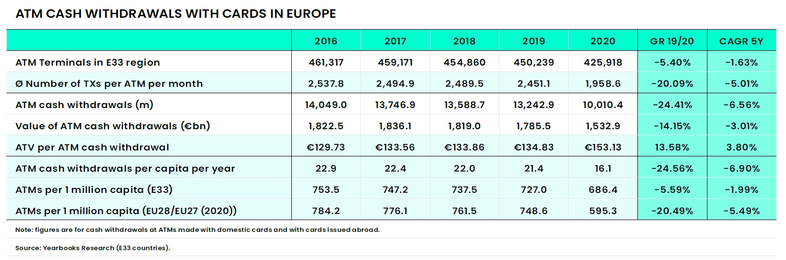 The total number of cash withdrawals across all E33 countries covered in the Yearbook showed an overall decline of -24.41% from 2019, and a compound annual growth rate decline of -6.56% over the last five years.