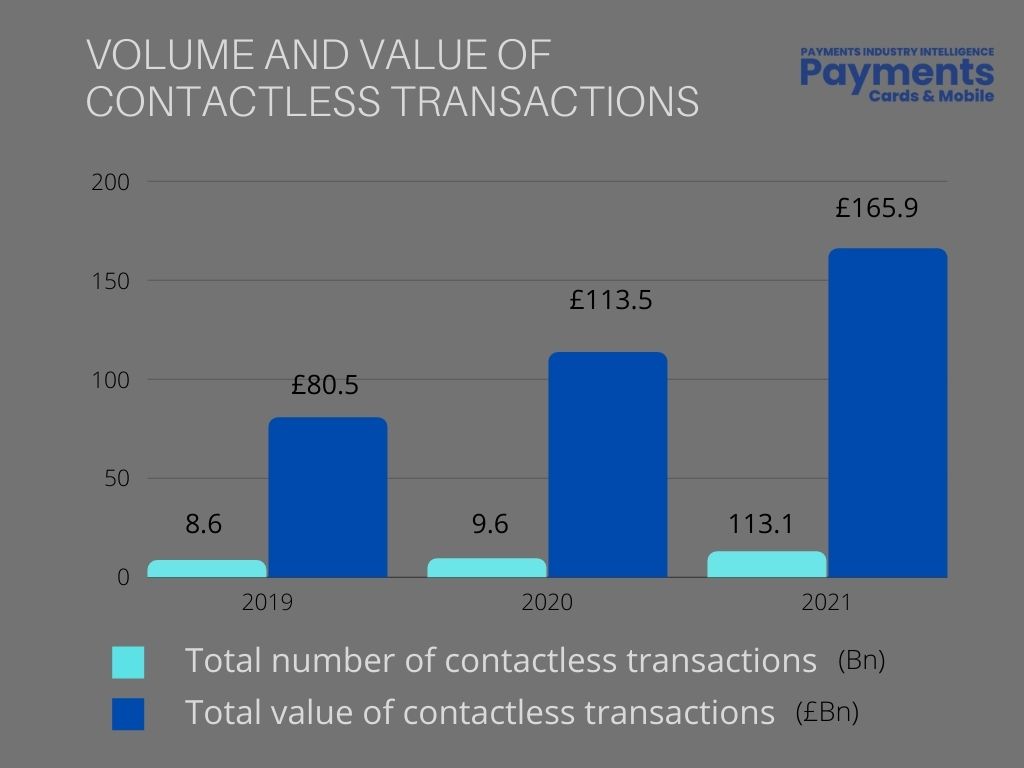 The total value of contactless transactions in 2021 also increased, reaching £165.9 billion. This is 46% higher than in 2020 and 106% more than 2019.