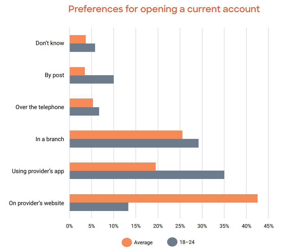 The role of the various digital channels available to consumers is also important for businesses to understand. Age seemed to play a strong factor in choice, as the older people were the more likely they were to prefer websites over apps for opening an account.