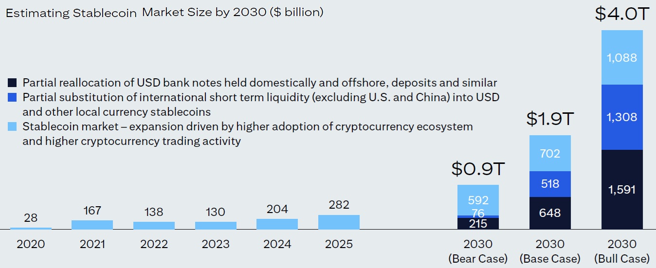 Banks already move trillions daily. If just five percent of large-value payment flows migrate to tokenised rails, the resulting volumes would eclipse the current stablecoin market.