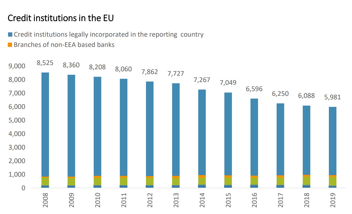 The Banking in Europe overview shows that the total number of credit institutions in the European Union has consistently fallen for eleven years in a row and declined by 1.8% in 2019 to 5.981 institutions, down by 2.544 since the contraction began.