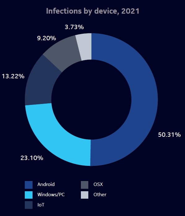 Among smartphones, Android devices remain the most targeted by malware due to the open environment and availability of third-party app stores. Android devices make up 50.31% of all infected devices, followed by Windows devices, which account for 23.1% of all observed infections.