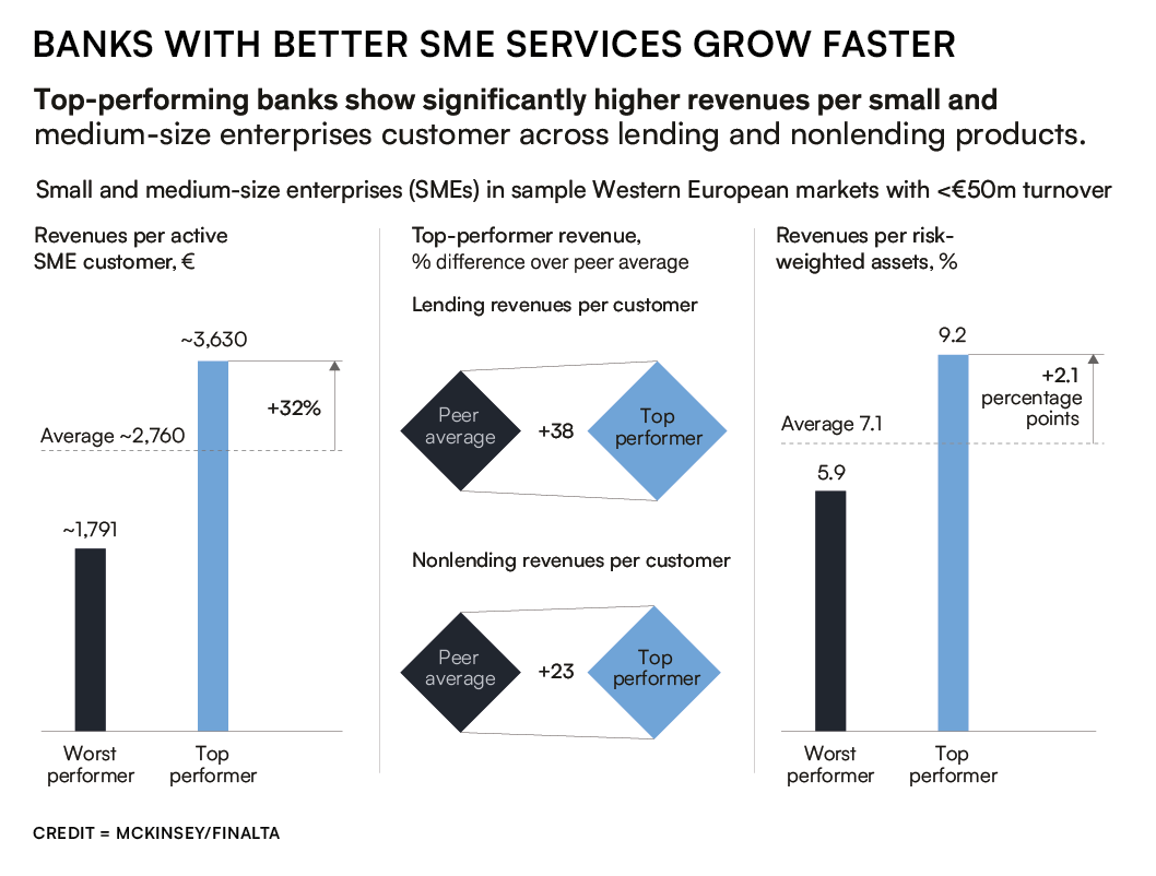 McKinsey and Company concur with this view, demonstrating how banks that attract more SME customers grow 32 percent faster than their peers.
