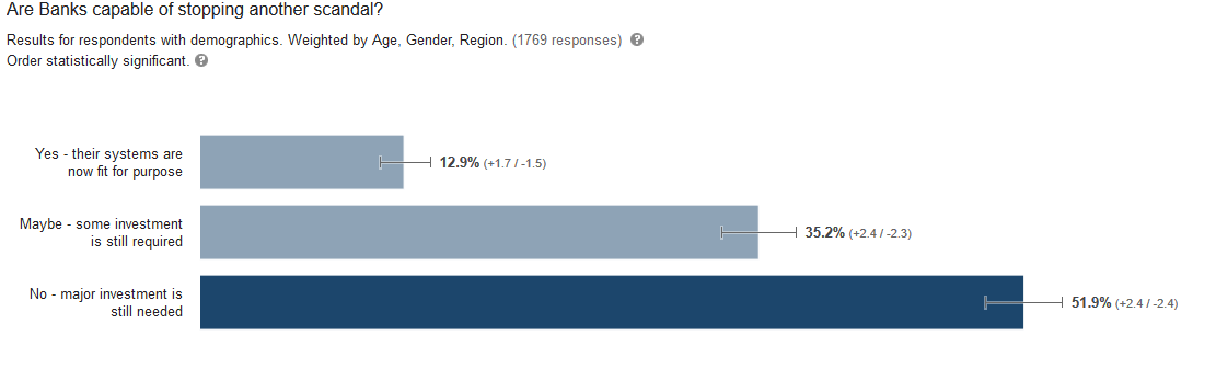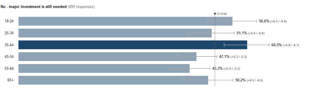 But 51% say it will take major investment to sort out the systemic problems that banks and financial institutions have, rising to over 60% in the 35-44 age bracket, a demographic acutely affected by the effects of the financial crisis on working families.