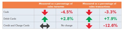 With contactless cards now widespread in the UK, debit cards comprised 50% of retail sales value in 2013, a rise of 11% over the last five years. Correspondingly, average debit card transaction values have declined, while the usage of cash has fallen by 14%.