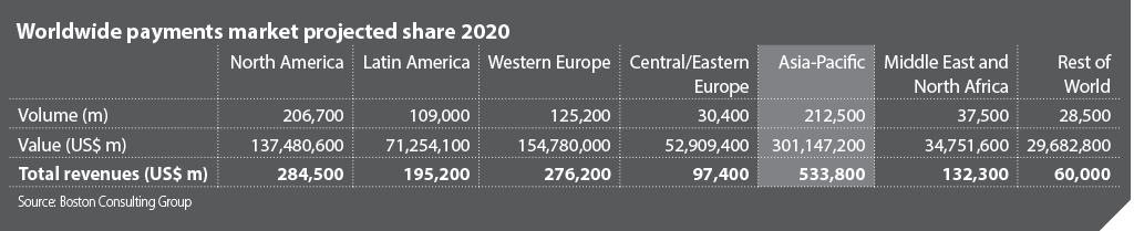 Worldwide payments market projected share 2020