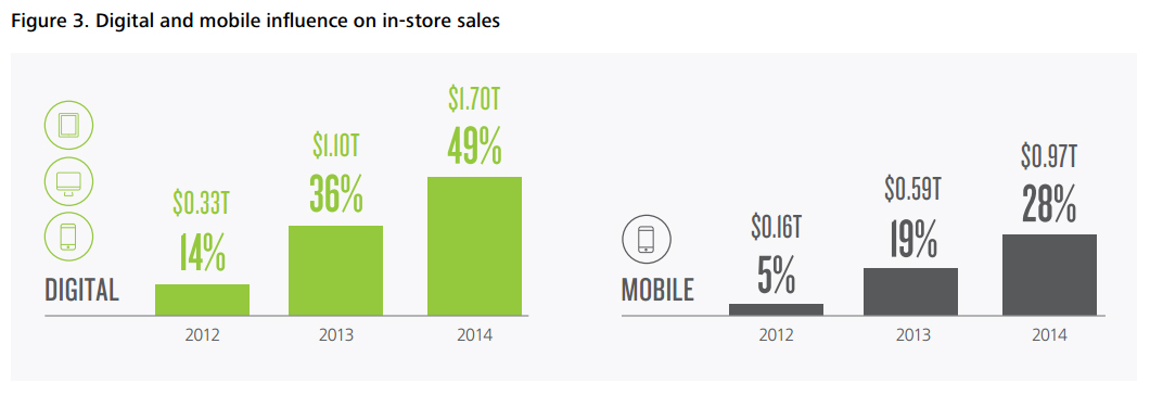 Digital interactions are expected to influence 64 cents of every dollar spent in retail stores by the end of 2015, or $2.2 trillion. While the upward trend in overall digital usage has accelerated since Deloitte Digital began tracking and measuring its influence on retail sales in 2012, this year’s study uncovered dramatic new behaviours, including: