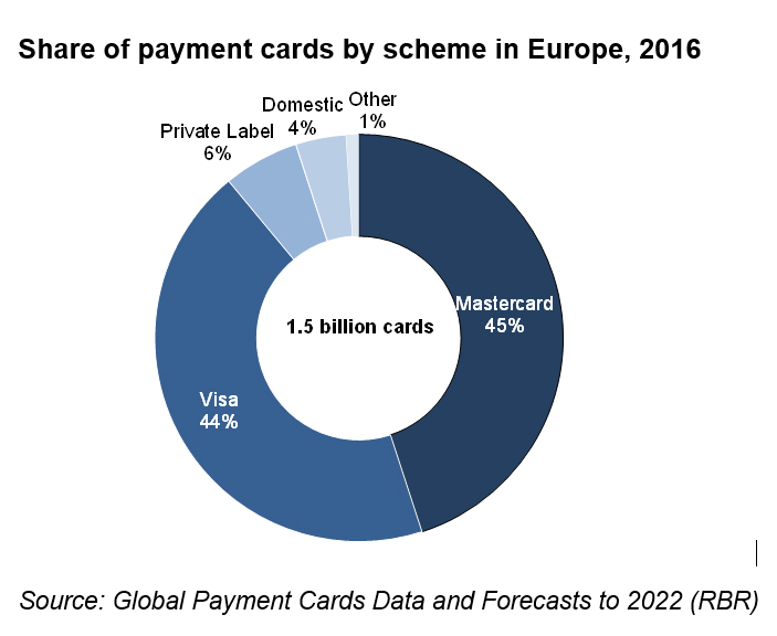 According to a new study, Global Payment Cards Data and Forecasts to 2022, card issuers in Europe are continuing to change the scheme of the cards they issue – particularly debit cards – from Maestro and Visa Electron to Mastercard and Visa.