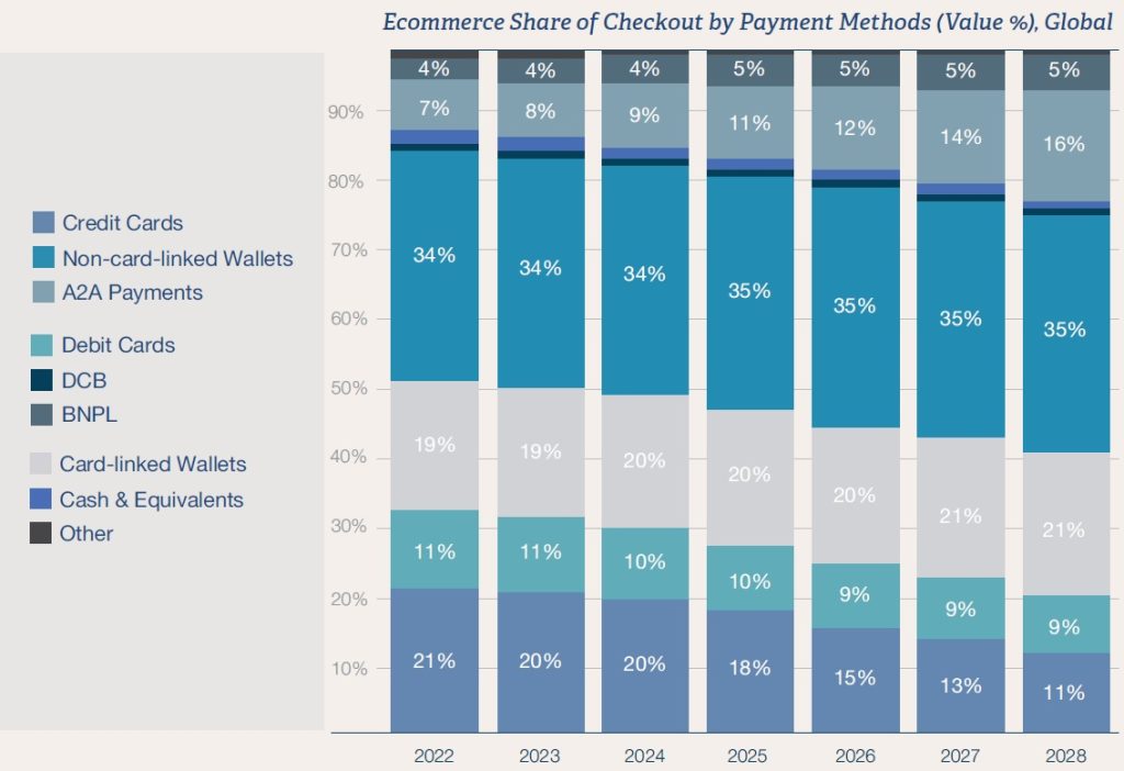 - Instant A2A & non-card-linked wallets to account for over 50% of e-commerce transaction value globally by 2028