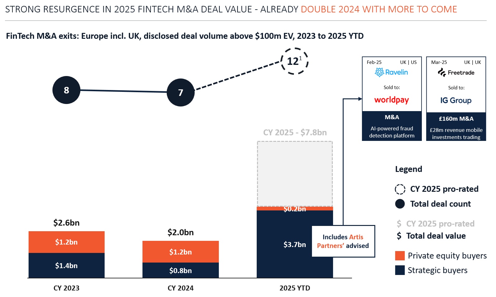 European fintech M&A is surging in 2025, with disclosed deal value for $100 million-plus transactions reaching $3.9 billion in H1 2025, almost double the total recorded for all of 2024.... read more