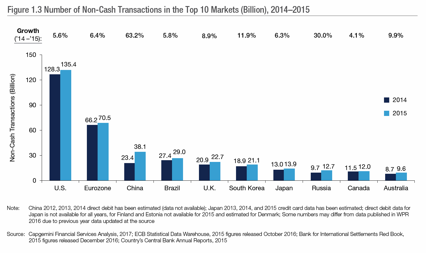 Within the top-10 markets for non-cash transactions volumes, China climbed to third place with 38.1 billion transactions, surpassing 2014’s number three market Brazil, which fell to fourth place with 29.0 billion transactions (Figure 1.3).