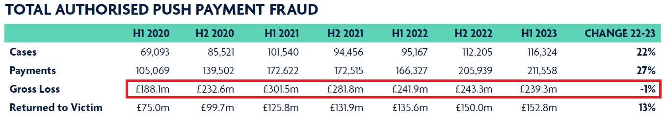 Industry data showed that fraud fell in the first six months of 2023, a decrease of 2% compared to the same period the previous year; and APP fraud, a type of fraud specifically targeted by CoP, has also seen a 1% fall compared to the same period the previous year.