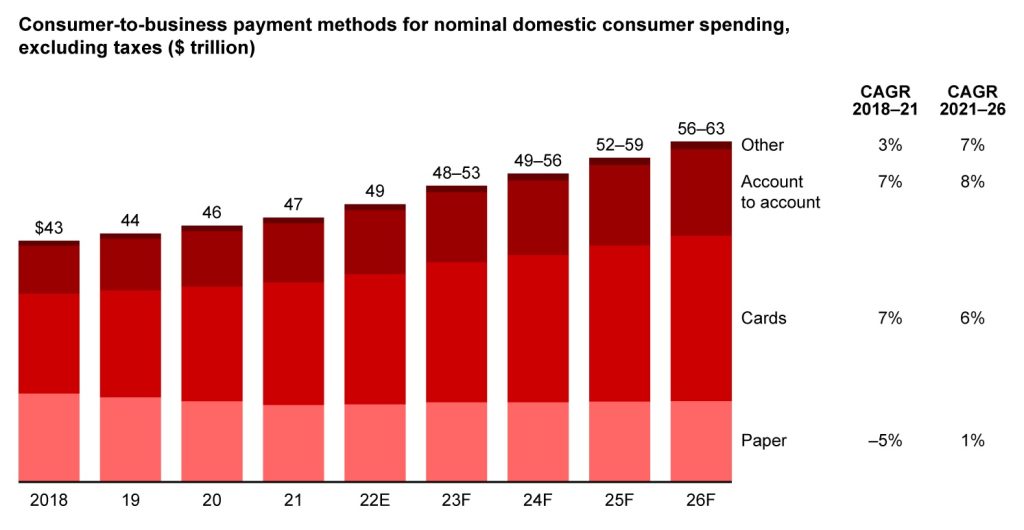 The analysis projects that global consumer card payment volume will grow about 6% annually through 2026.