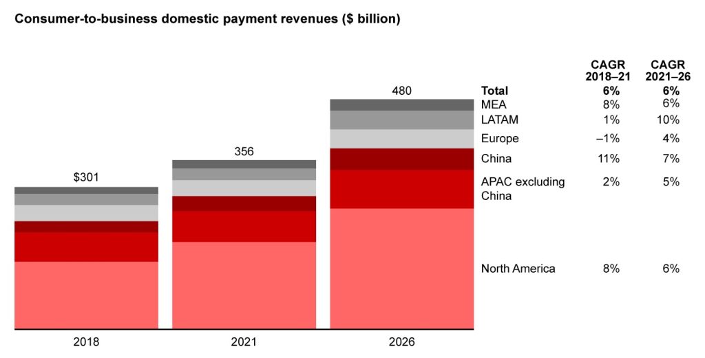 Retail payments is a rich and promising industry, earning what Bain & Company estimates as $356 billion in global revenue in 2021, with projected annual growth of 6% to $480 billion by 2026 (see Figure 1).