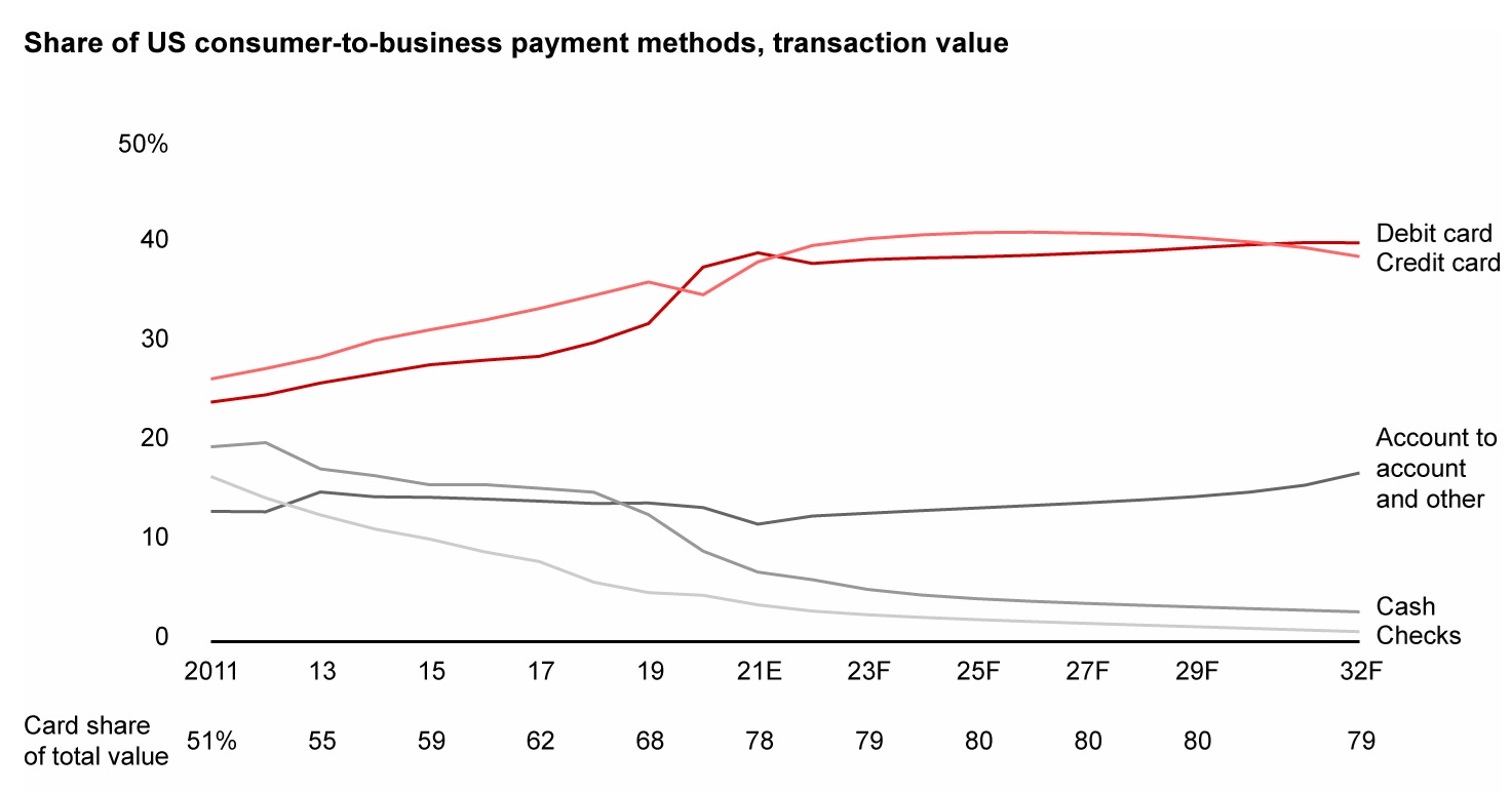 The report expects US credit and debit cards to peak at just over 80% of transaction value in 2029, based on current trends (see Figure below).
