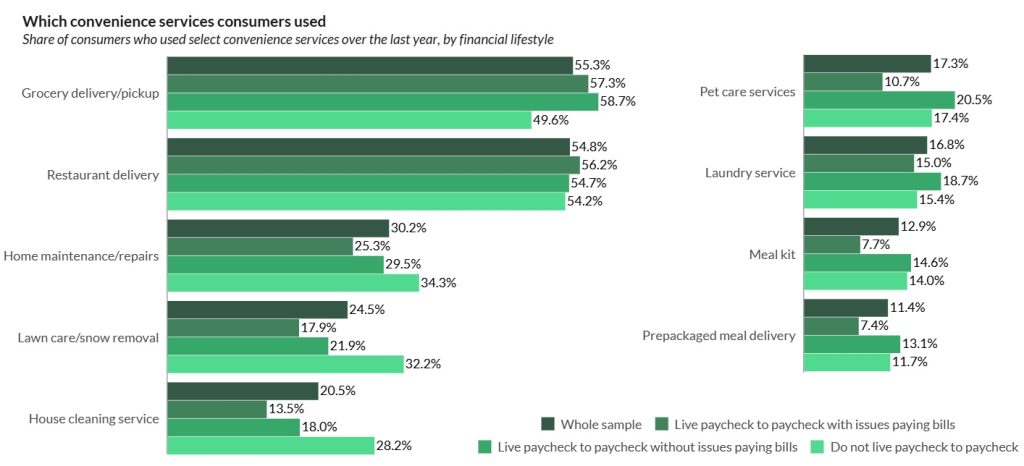 Moreover, the data reveals that consumers not living paycheck to paycheck are significantly more likely to use home maintenance (34%), lawn care (32%), and house cleaning (28%) services than those with bill-paying difficulties, whose usage stands at 25%, 18%, and 14% respectively.