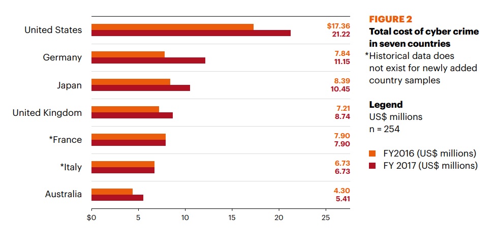 Among the organisations we studied, information loss represents the largest cost component with a rise from 35% in 2015 to 43% in 2017. It is this threat landscape that demands organisations re-examine their investment priorities to keep pace with these more sophisticated and highly motivated attacks.