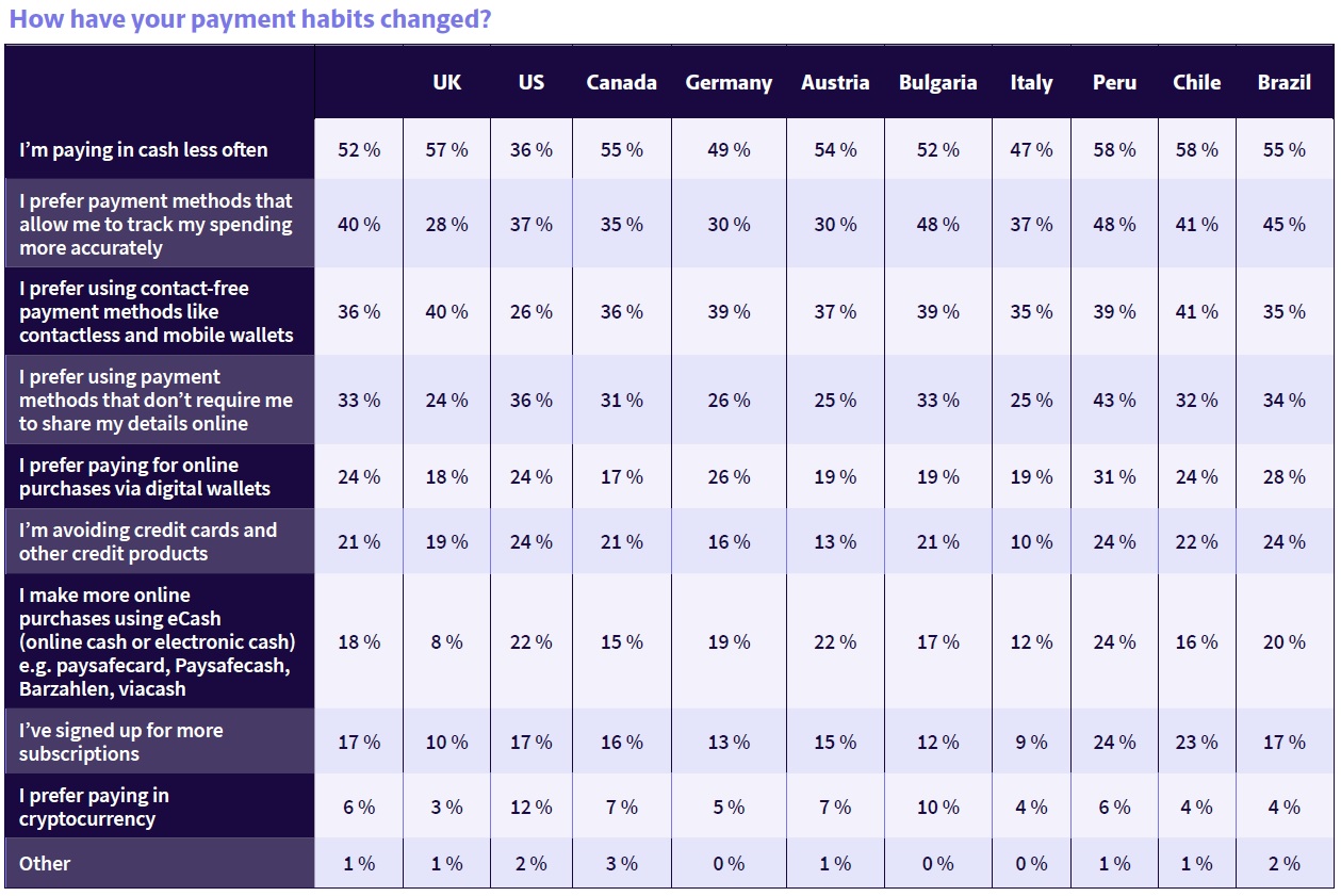 Interestingly, credit card usage has spiked in the traditionally debt-averse DACH region where 46% of Austrian respondents and 39% of German respondents are using them more frequently.
