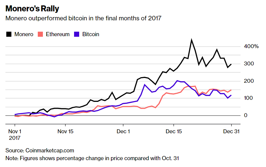 Monero quadrupled in value to $349 in the final two months of 2017, according to coinmarketcap.com, placing it among a number of upstart coins that rose faster than bitcoin, the world’s most valuable digital currency. Bitcoin roughly doubled in the same period, data compiled by Bloomberg show. Monero’s price has climbed another 7 percent so far this year, according to coinmarketcap.com.