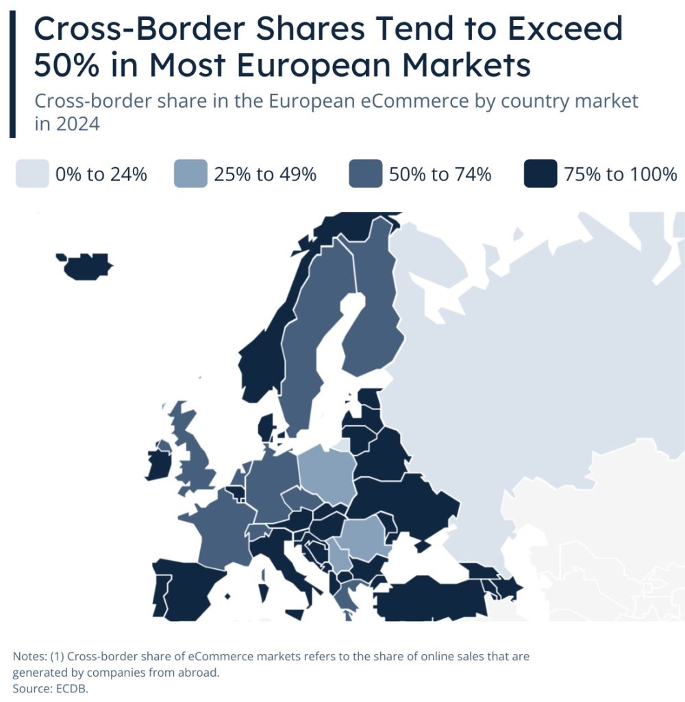 Germany’s case is particularly illustrative: despite being home to some of Europe’s most prominent e-commerce firms, its cross-border share still approaches 60%, driven by the omnipresence of global giants like Amazon and the inherent borderlessness of digital commerce.