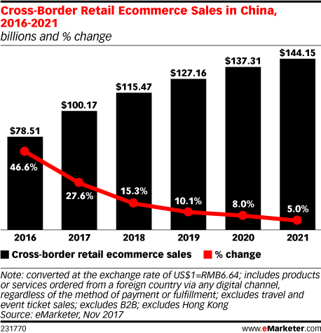Total cross-border e-commerce sales in China are expected to reach $100.17 billion by the end of 2017, with the average spend per cross-border digital buyer at $882. Average spend per buyer has increased since eMarketer’s previous forecast due to the growing awareness of overseas brands in China, as well as better logistics and the perception that foreign goods are of better quality.