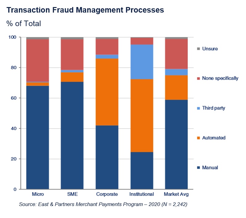 East & Partners asked businesses with merchant payments facilities in place, “What processes do you currently have in place to manage transactions for fraud?” The results revealed one in five merchants have no processes in place to manage transaction for fraud whatsoever (19.7%), noting Micro-businesses were five times more ambivalent than institutional enterprises at 27.8% and 4.6% respectively. While large corporates exhibit a higher usage of manual or automated processes, a surprisingly low level of third-party integration is sought out. One in five institutional merchants use third party systems to protect against payments fraud (22.5%), falling to only one in ten corporates (10.4%) and sub 2% for small businesses.