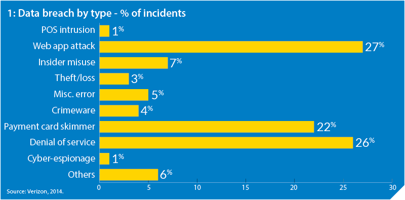 Global security solutions specialist Verizon recently published its seventh annual data breach report, analysing more than 1,300 confirmed data breaches as well as more than 63,000 reported security incidents. The 2014 report also analysed 856 security incidents within the finance sector, including 465 where a data breach was confirmed. With all the news around POS attacks at major retailers, the report found that industries commonly hit by POS intrusions are restaurants, hotels, grocery stores and other brick-and-mortar retailers, where intruders attempt to capture payment card data. Verizon states that such attacks, while high-profile, are not really indicative of the actual picture of cyber-crime.