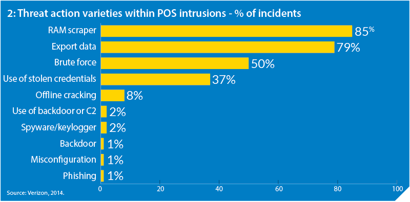 Breaches of POS systems are centred around network vulnerability, according to Verizon. Perpetrators scan the internet for open remote-access ports and if the script identifies a device as a POS, it issues likely credentials (brute force) to access the device. They then install malware (RAM scraper) to collect and exfiltrate (export data) payment card information.